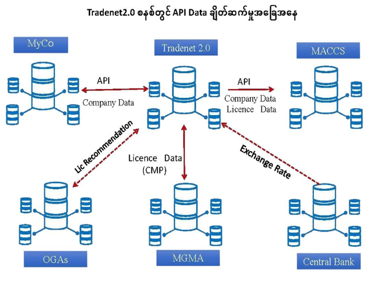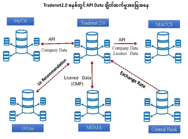 ရင်းနှီးမြုပ်နှံမှုနှင့် ကုမ္ပဏီများ ဦးစီးဌာန၏ MyCo စနစ်နှင့် ချိတ်ဆက်၍ ရယူခြင်း၊ အကောက်ခွန် ဦးစီးဌာန၏ MACCS စနစ်ဖြင့် ချိတ်ဆက်၍ ပို့ကုန်သွင်းကုန် လုပ်ငန်းရှင် မှတ်ပုံတင်လက်မှတ် အချက်အလက်များနှင့် လိုင်စင်ပါမစ် အချက်အလက်များ ပေးပို့ခြင်း၊