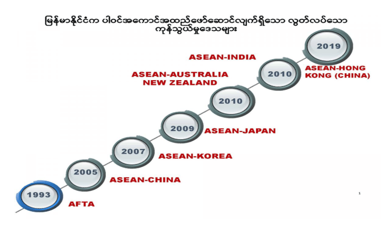မြန်မာနိုင်ငံ ပါဝင် အကောင်အထည် ဖော်ဆောင်လျက်ရှိသော Free Trade Area (၇) ခုအနက် အာဆီယံ-ကိုရီးယား၊ အာဆီယံ-ဟောင်ကောင်၊ အာဆီယံ-သြစတြေးလျ၊ နယူးဇီလန်၊ အာဆီယံ-ဂျပန် FTA တို့၏ ခွင့်ပြုထုတ်ပေးသော CO Form (၅) မျိုးပေါ်တွင် ရုံးတံဆိပ် (e-seal) နှင့် အရာရှိလက်မှတ် (e-signature) တို့အား အီလက်ထရောနစ်စနစ်ဖြင့် အသုံးပြု စိစစ် ထုတ်ပေးနိုင်ရေး ခွင့်ပြုပေးခဲ့သည်။